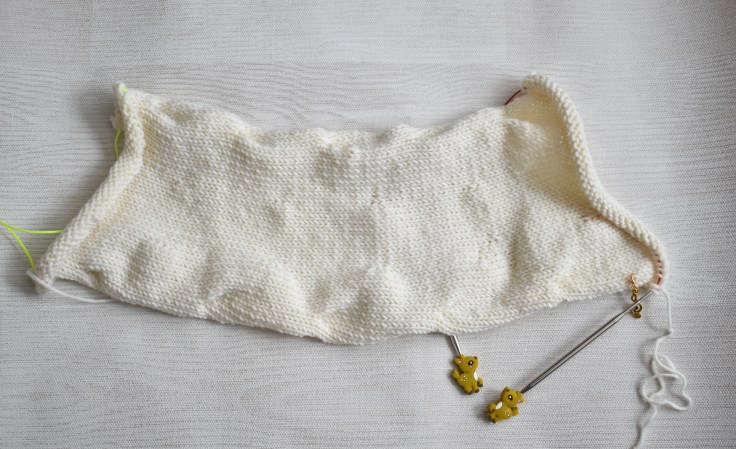 Nun kommen wir aber doch noch mal kurz zu dem Design selbst. Der Cowl wird quer gestrickt. Abweichend von der Anleitung habe ich einen provisorischen Maschenanschlag genutzt und am Ende die aktiven Maschen der beiden Ende mit dem Maschenstich verbunden. Vielleicht hätte eine Naht oder ein Three-Needle-Bindoff mehr Stand gegeben, aber optisch finde ich es so schöner.