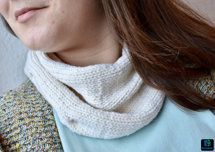 Dazu kam nun aber, dass ich schon im letzten Winter immer mal wieder genervt war, weil ich zwar tolle Pullis und tolle Tücher habe, aber diese häufig gemeinsam getragen dann doch „too much“ sind. Es keimte also der Wunsch nach einem schlichten Halswärmer auf, der sich allem anderen unterordnet.