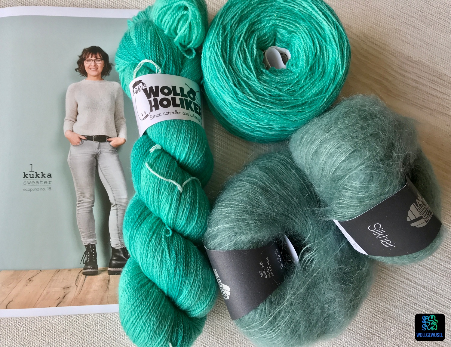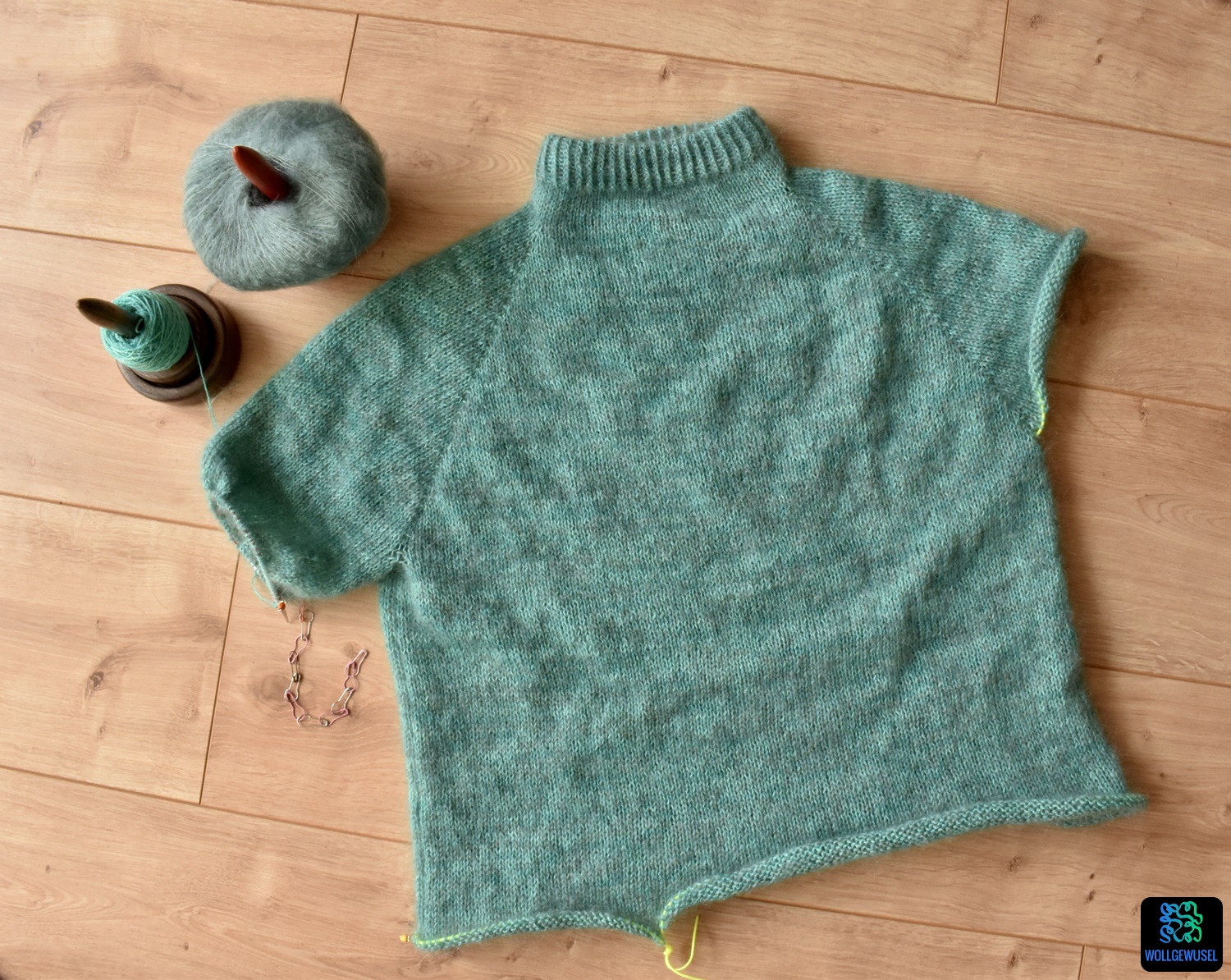Das Strukturmuster aus linken Maschen am Rumpf habe ich weggelassen. Dies wäre m.E. durch das Mohairgarn eh untergegangen, sodass ich mir die Mühe gespart habe und ein ganz schlichter Pullover entstanden ist. Durch das handgefärbte Lacegarn ist trotzdem etwas Leben drin und die Farbe ist der Knaller. Leider kommt das satte Türkis auf den Bildern gar nicht richtig rüber. Am besten kommt dies bei dem Prozessfoto unten heraus, wo das Garn noch im Strang zusehen ist. Ein Träumchen. Irgendwie ist das gerade total meine Farbe. Ist ja auch ganz gut. Kann ja nicht immer alles Petrol sein. :D Okay, zugegeben, soweit weg ist Türkis von Petrol nicht. Pscht! Sag’s keinem! :)