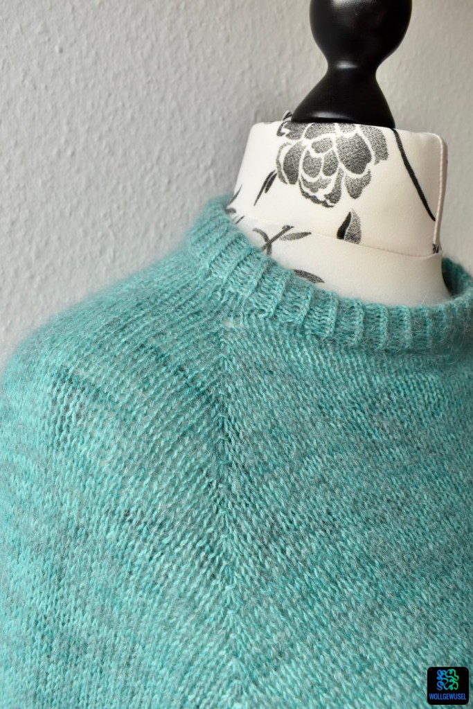 Zum Design selbst bleibt kaum etwas zu sagen. Es ist ein ganz einfacher Raglanpullover. Das doppelte Halsbündchen habe ich beibehalten und die zu Beginn provisorisch angeschlagenen Maschen nach der gewünschten Bündchenlänge mit den aktiven Maschen zusammengestrickt.