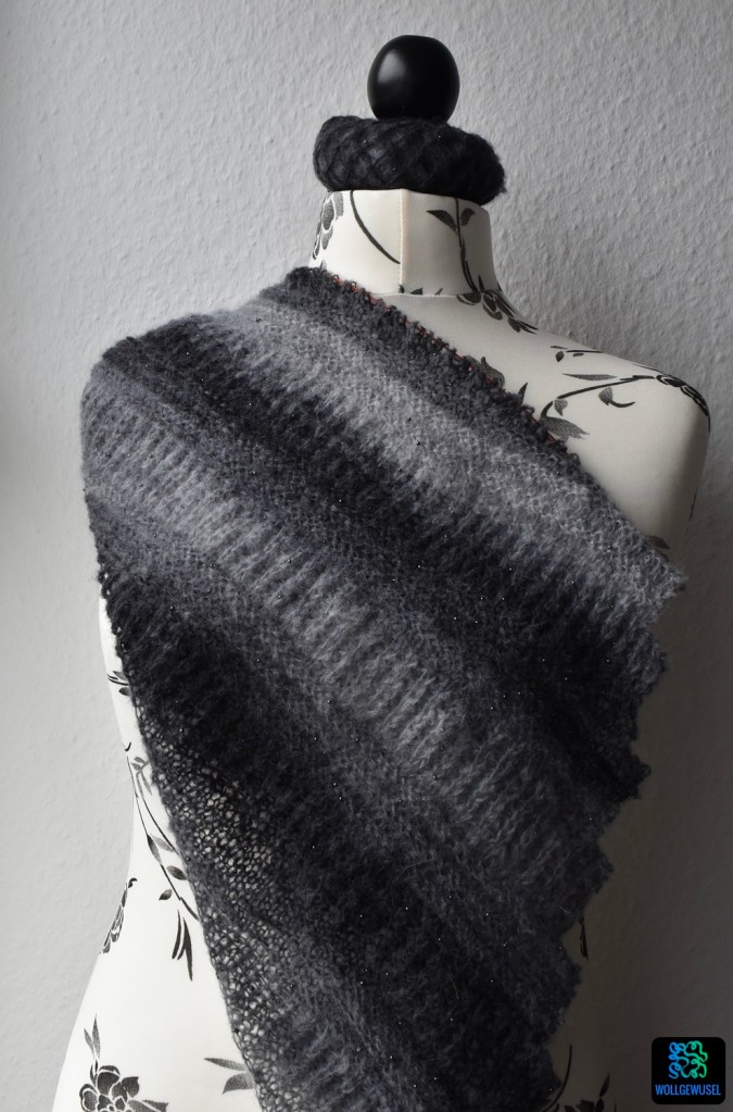 Da ihr meiner so guzt gefallen hat, habe ich mühsam das gleiche Garn in grau mit leichtem Farbverlauf beschafft, was gar nicht so einfach war, da das schon länger nicht mehr produziert wird. Aber ich habe noch was bekommen. Hier sind die Perlen nun nicht durchsichtig sondern anthrazit, würde ich sagen. Ich finde es sehr schön und habe auch schon wieder zwei Knäul von fünf verstrickt. Die Strukturstreifen fliegen einfach nur so von der Nadel und man sieht schnell einen Fortschritt.