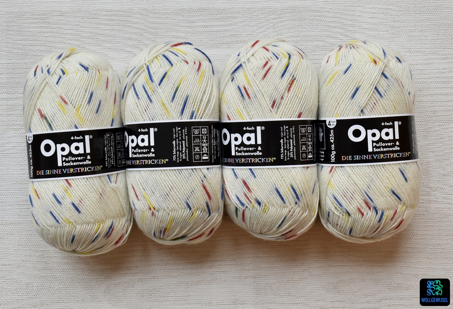 Mit der Konfetti-Färbung von Opal habe ich mir einen Wunsch erfüllt. Wenn ich das richtig in Erinnerung habe, war die irgendwann mal im Opal-Abo drin und somit nicht frei zu bekommen. Und durch Zufall, bzw. weil ich mal wieder mit dem Abo geliebäugelt habe, habe ich auf der Opal-Seite gesehen, dass man das Garn dort nun bestellen kann. Wuhu, da musste dann also eine Pullovermenge her. Yeayyeay! Ich vermute das ist zeitlich begrenzt.