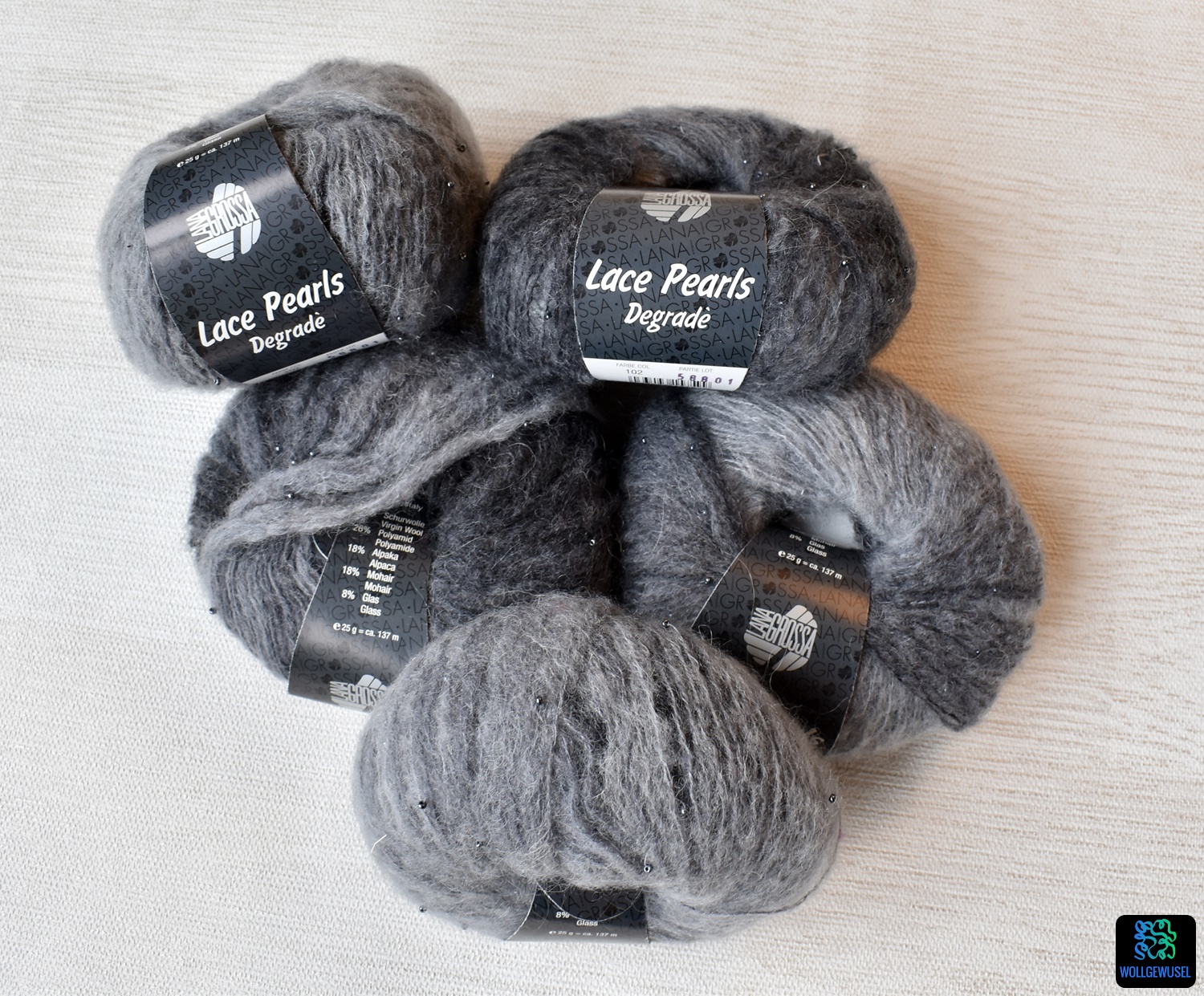 Für das Tuch für meine Kollegin habe ich beim Durchforsten des Internets tatsächlich noch fünf Knäul Lana Grossa Lace Pearls in Grau auftreiben können. Allerdings nicht unifarben wie bei meiner braunen Variante sondern es ist eine Degradé-Färbung mit leichten Farbwechseln. Die Beschaffung war so umständlich, da das Garn nicht mehr produziert wird.
