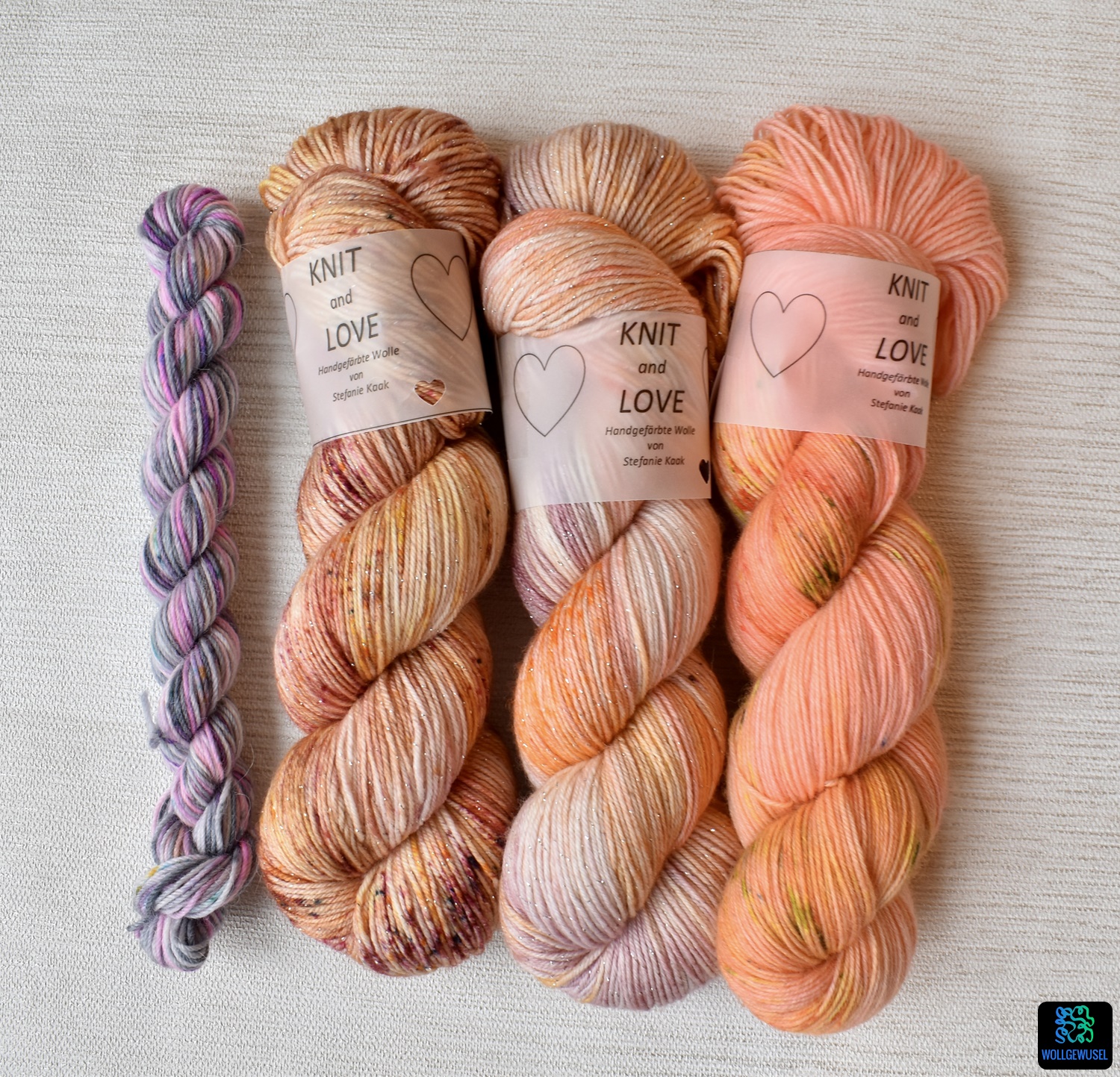 Bei meiner Bestellung bei Knit and Love hat mich das Sale-Schild bekommen. Ich habe dort wirklich außerordentlich günstig zwei sehr ähnliche Stränge Glitzersockenwolle und einen Strang etwas orangestichigere Sockenwolle ohne Glitzer erworben. Als Zugabe gab es dann auch noch einen Mini etwas außerhalb meiner farblichen Komfortzone, aber trotzdem ganz hübsch! Auf diese Handfärberin bin ich mal aufmerksam geworden, da sie aus Neumünster und somit nicht allzu weit weg von mir ansässig ist. Seit dem schaue ich dort unregelmäßig immer mal wieder in den Shop. Dies war aber nun meine erste Bestellung.