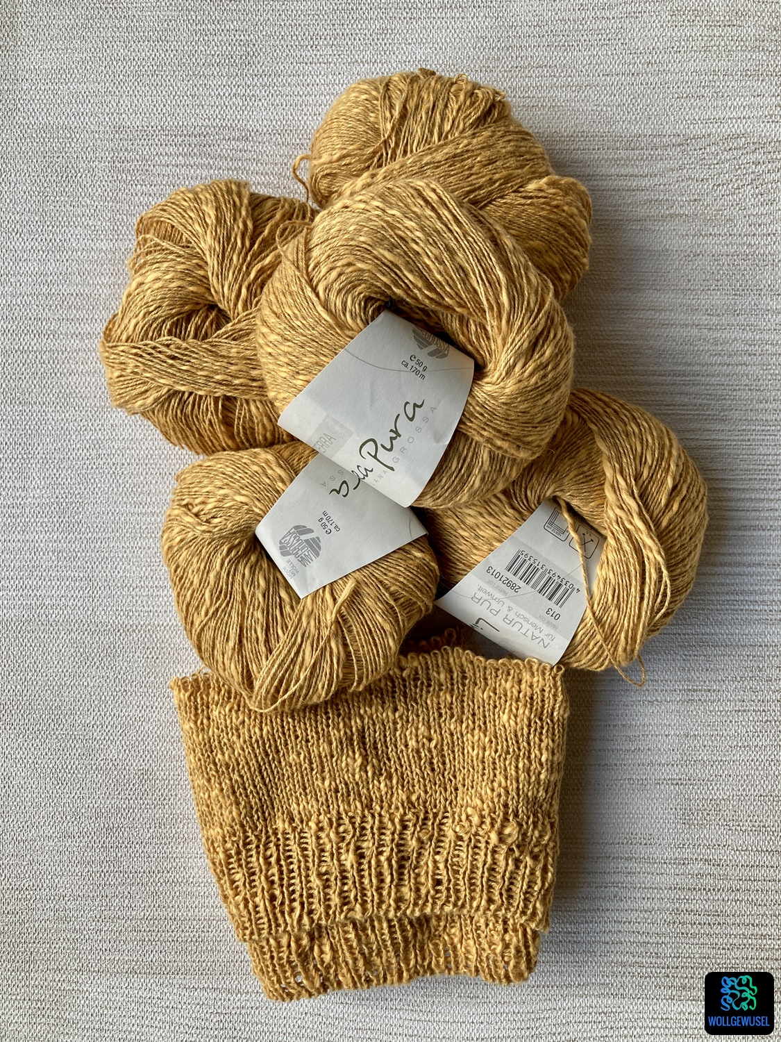 Außer der Reihe habe ich außerdem mehr oder weniger sechs Knäul eines Sommergarns von Lana Grossa, der Linea Pura Terra aus Leinen und Baumwolle ich einem schönen goldgelb „gebraucht“ gekauft. Die habe mich einfach angelächelt. Das Garn hat eine interessante Struktur und ich kann mir daraus super ein luftiges Suommershirt vorstellen!