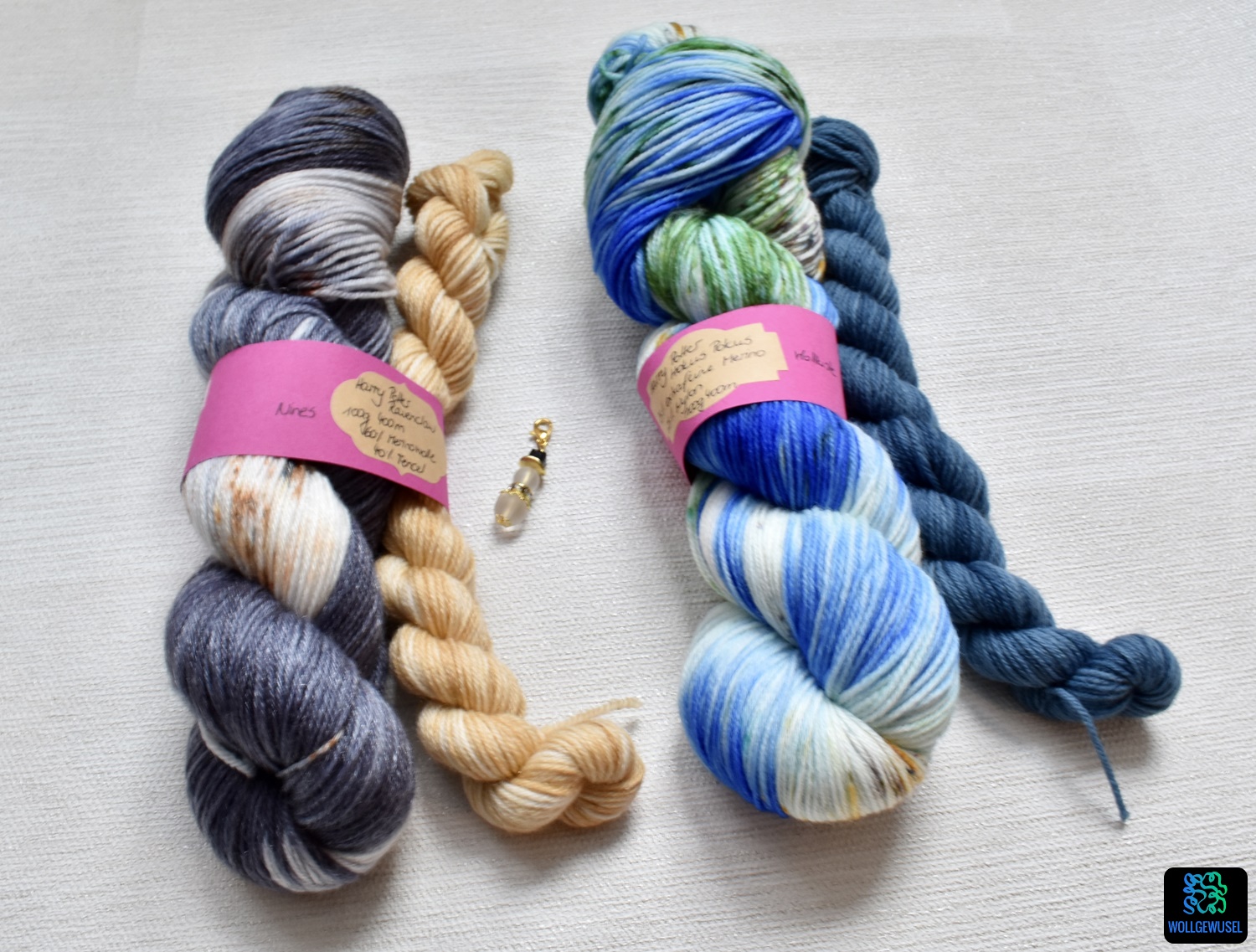 Und als wäre das noch nicht genug, habe ich die erste Lieferung des HarryPotter-Sockenwollclubs von Nines Wollkiste (Etsy-Shop) erhalten. Die Januarfarbung heißt Hokuspokus und ist eine Mischung aus Grün und Blau auf weißem Grund mit einem passenden Mini dazu. Gefärbt auf einer Merino-Sockenwolle. Dazu habe ich mir das Ravenclaw-Sockenset auf einer Sockenwollbasis mit 40% Tencel und ohne Kunstfaser bestellt. Die ist wirklich zauberhaft. Mal schauen, was es in den kommenden zwei Monaten geben wird.