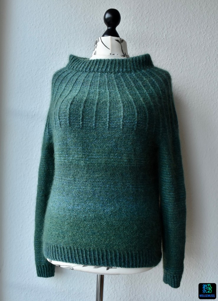 Auch der Gamine von Yoko Hatta (ravelry-Link) aus der DesignerKnitting 03/2020 ist inzwischen fertig geworden. Das ist ein relativ weit geschnittener Pullover, der von außen glatt links gestrickt daherkommt. In der Passe entsteht durch rechte Maschen ein strahlenförmiges Muster hin zum Halsausschnitt.
