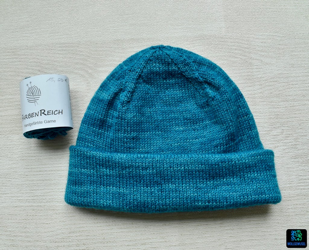 Von der Anleitung bin ich sehr angetan. Ich war skeptisch. Ist es doch eine ganz einfach Mütze, wenn auch durch das Ineinanderstülpen nicht im klassischen Sinne, aber stricktechnisch kein Hexenwerk. Aber die Anleitung lohnt sich. Sie enthält für verschiedenste Maschenproben alle erforderlichen Maschenzahlen etc. für Größen vom Kleinkind bis zum großen Männerkopf. Die werde ich sicherlich nochmal stricken! Das ein oder andere Knäul Sockewolle hätte ich auch noch… :D