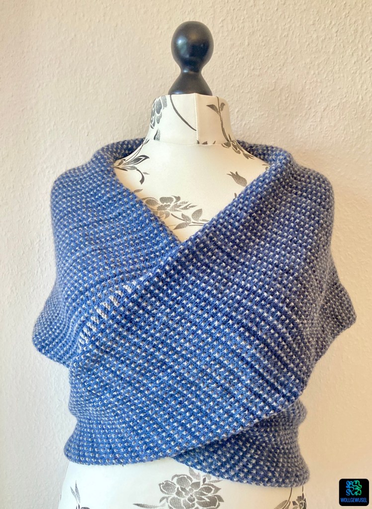 An der breitesten Stelle ist das Tuch keine 50cm breit und ich kann es gut dreimal um den Hals wickeln. So mag ich Tücher am liebsten tragen. Ich habe es aber auch schon als Jackenersatz getragen. Dabei lege ich es um die Schultern, kreuze die Enden vor dem Körper und knote sie hinten im unteren Rücken zusammen. Das ist jetzt in der Übergangszeit häufig schon ausreichend.