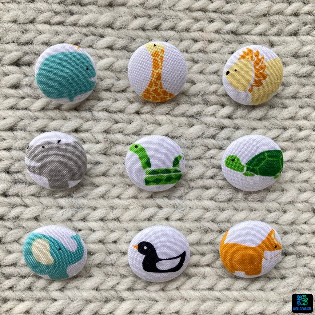 Ich habe auf Etsy bei MissElva ein so zuckersüßes Knopfset gefunden, dass ich nicht wiederstehen konnte. Es sind neun bezogene Knöpfe mit verschiedenen Tiermotiven drauf. So herzig! Die werden bei zukünftigem Kinderstrick zum Einsatz kommen.