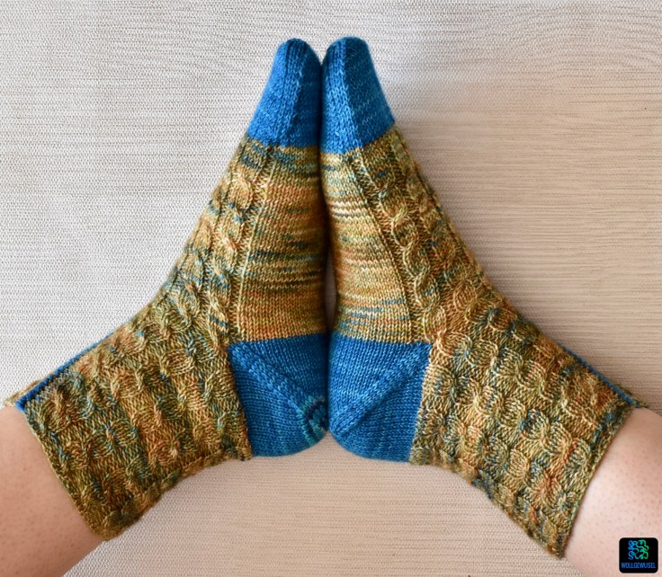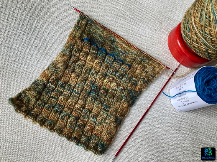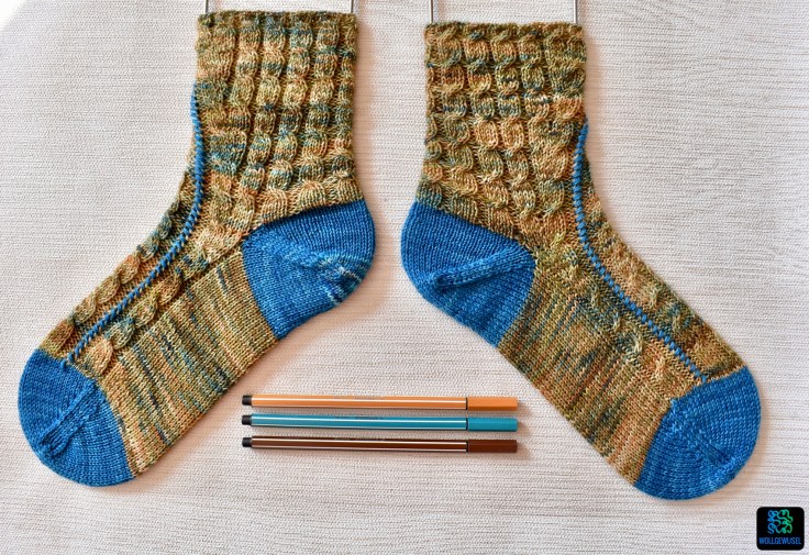 Als die Anleitung für diese Socken im Zuge der diesjähirgen Sockmadness in mein Postfast gespühlt wurde, schoss mir sofort eine Farbkombination in den Kopf. Ich hatte einen Strang Sockenwolle im Wollberg, den ich selbstgefärbt habe und auf den ich auch ein wenig stolz bin. Eine Mischung aus braun/ocker mit grünen und blauen Einschlägen. Dazu hatte ich kurz vorher einen Rest zurück in den Wollberg geräumt, nämlich den von meiner zweiten Schwiegermütze. Ein semisolides, handgefärbtes Sockengarn von FarbenReich (ohne Internetpräsenz) in Petrol. Während des Strickens musste ich mir dann noch einen zweiten, farblich passendes Rest suchen, weil mir ganz knapp vor Ende das Garn ausging. Das ist dann ein kleiner Rest Sockenwolle vom Mondschaf in der Farbe Totoro geworden. Aber dazu später mehr.