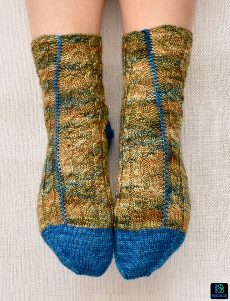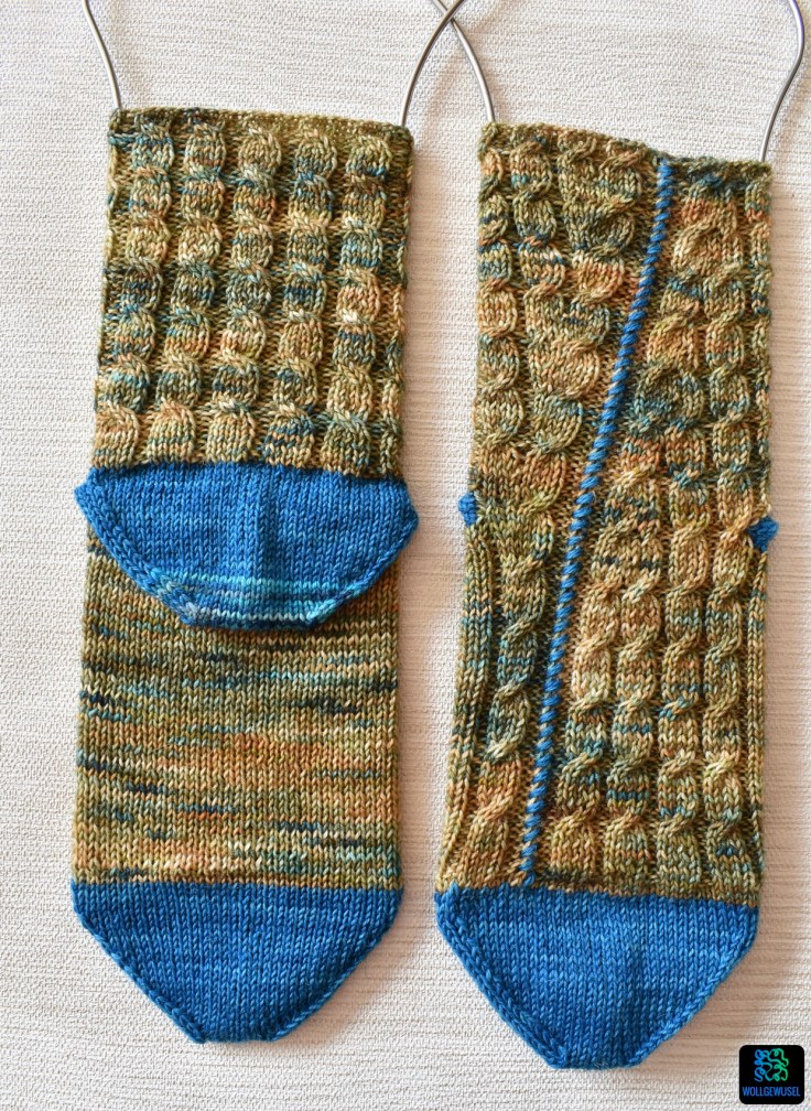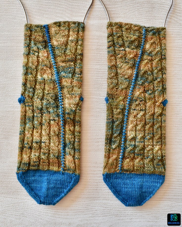 70 Maschen für eine Socke ist für meine Füße verhältnismäßig viel. Gearbeitet habe ich wie üblicherweise mit 2,5mm Nadeln. Die große Maschenazahl resultiert aus dem Zopfmuster, das das Gestrick zusammenzieht und weniger elastisch macht, und auch die Kontrastnaht zwängt das Gestrick etwas ein und verhindert die Elastizität wie wir sie von glatt rechts gestricktem Gestrick kennen. So sitzen die Socken jetzt angenehm eng am Fuß und beim Anziehen ist es über die Ferse sogar relativ eng (hoher Spann und so) aber noch vollkommen im Rahmen.