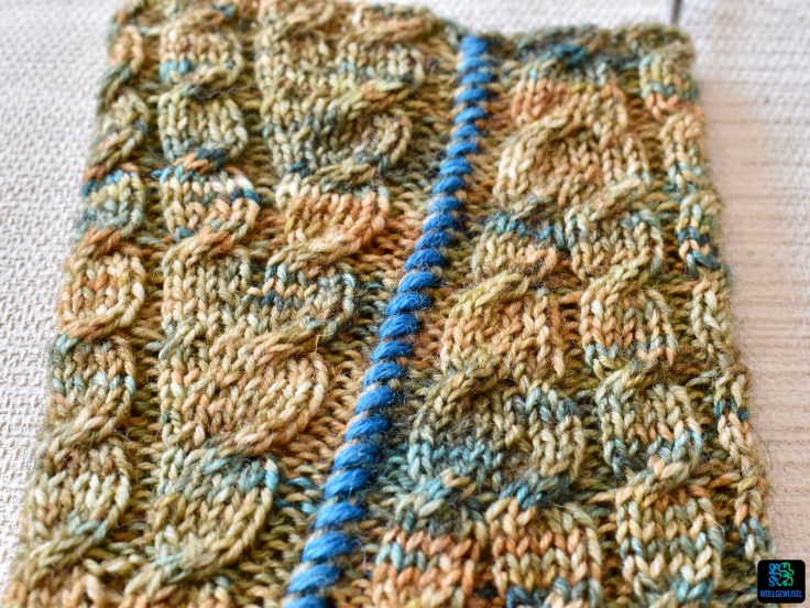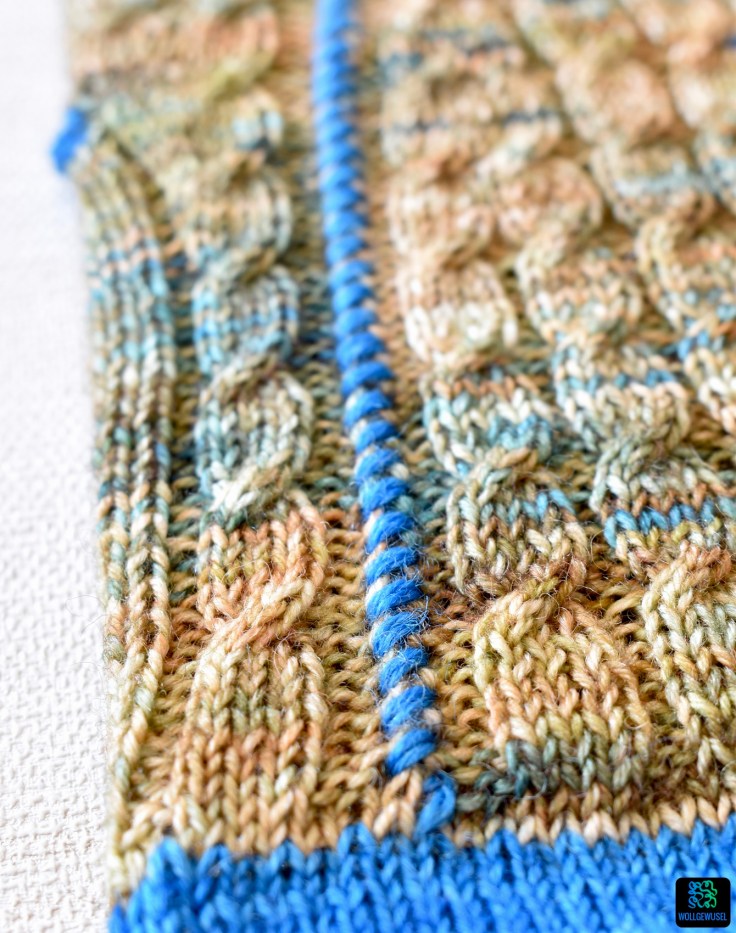 Nach einer Weile wird in das Läppchen auf halber Breite ein Kontrastfaden eingearbeitet, um die Stelle für die Ferse zu markieren und dann geht es weiter mit dem eingängigen Zopfmuster. Dadurch dass man ein Parallelelogramm strickt, erzeugt man die über den Fuß wandernde Naht in der Kontrastfarbe, die entsteht, wenn man die beiden Kanten des Lappens am Ende zusammen näht.