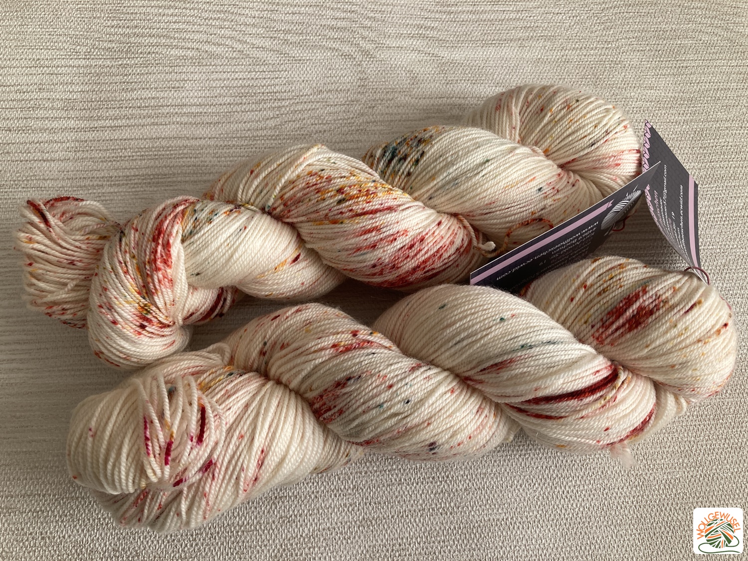 - zwei Stränge Merino High Twist vom Wollhäschen in creme mit überwiegend roten Sprenkeln. Daraus möchte ich mir glaube ich ein Tuch stricken.