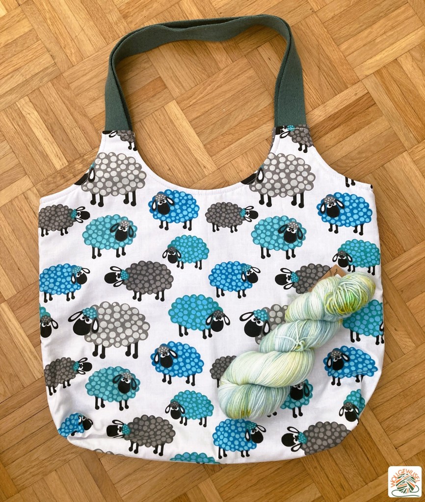 Passend zum Wollfestbesuch hat meine Begleitung uns Einkaufstaschen genäht. So zuckersüß! Ich durfte aus zwei Farbvarianten wählen und nahm, relativ berechenbar, die in Petrol/Türkis/Blau. Du kannst sie oben auf dem Beutefoto vom Wollfest bereits sehen, aber ich füge auch noch mal einh separates Bild an. Die Tasche hat eine gute Größe. Zum Vergleich siehst du einen Strang Sockenwolle im Bild. Die Träger sind richtig schön stabil und haben die perfekte Länge. Die Tasche hat mich bereits gut gefüllt zu einem Spieleabend begleitet und wird sicherlich auch das ein oder andere mal mit zum Einkaufen kommen. Danke, Henrike! :)