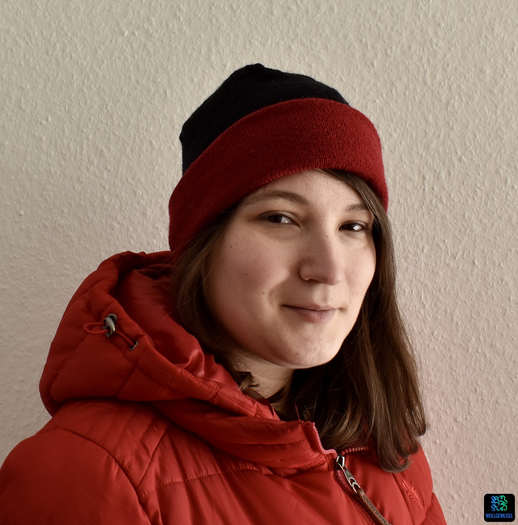 Ziel war ein Mütze, die aufgrund der Konstruktion ja als Wendemütze getragen werden kann, in schwarz und rot. Nun sollte aber die rote Variante auch einen roten Umschlag haben und die schwarze Mütze bekommt somit automatisch ebenfalls einen roten, da sonst zu viele Farbwechsel an exakt den richtigen Stellen nötig wären, was die Flexibilität beim Tragen deutlich eingeschränkt hätte. Somit galt es nur die richtige Stelle für den einen Farbwechsel von rot zu schwarz zu auszumachen. Ich gebe zu mehr Aufwand als Schätzen habe ich nicht betrieben, aber das Ergebnis passt.