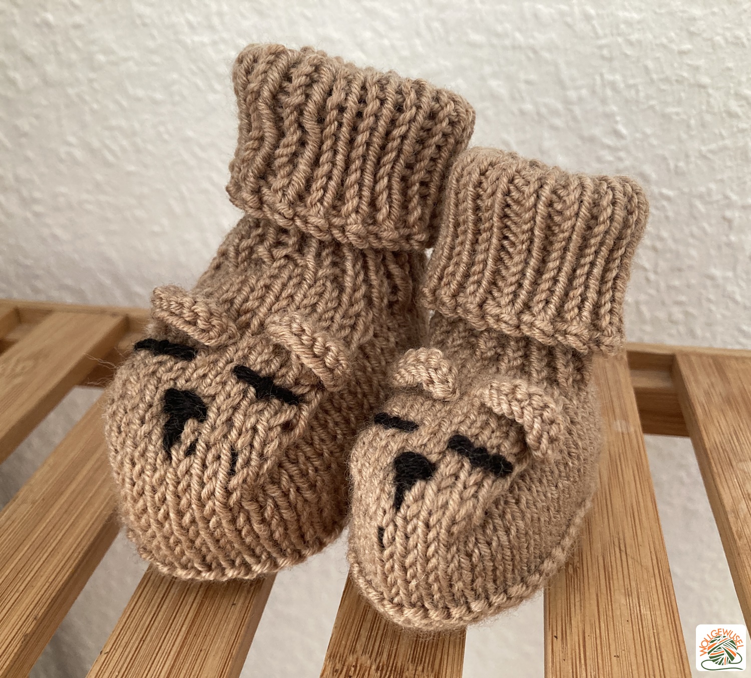 Aktuell stricke ich an den Mini Bjørn Tøfler von Frida Råberg (ravelry-Link). Das sind süße kleine Baby-Schühchen mit einem aufgestickten Gesicht und kleinen Öhrchen für eine ehemalige Kollegin von mir. Diese Schuhe sind spannend konstruiert. Sie werden nahezu im Stück gestrickt und man muss am Ende nur noch eine Naht schließen. Selbst die Ohren werden schon mit angestrickt, sodass am Ende nur eben eine kurze Naht, das Fädenvernähen und Besticken bleibt.