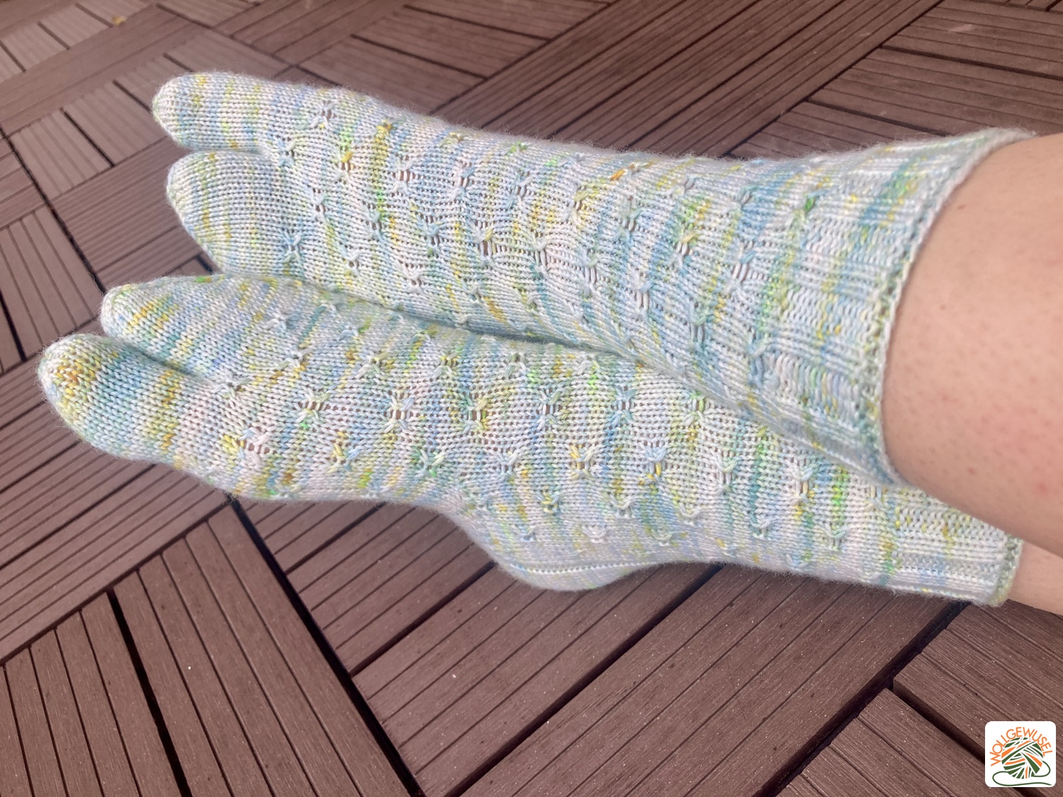 Gestrickt habe ich sie aus einem schönen Merino-Sockengarn von der Wollnerin in kalten Blautürkistönen mit gelb-orangen Speckles. Muster und Färbung harmonieren wunderbar und ich bin sehr zufrieden mit dem Ergebnis.