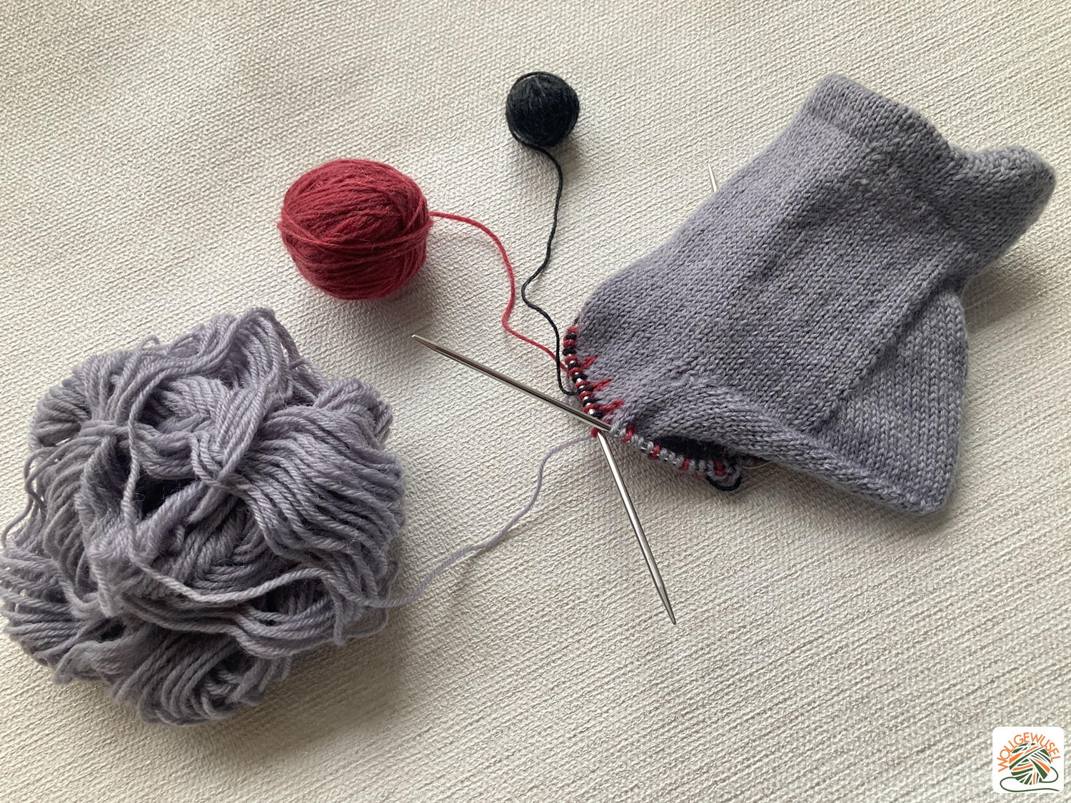 Das Muster wird dann rot, auch eine Discounterwolle, z.B. benutzt bereits bei den CajaSocks von Sockshype, und mit kleinen antrazitfarbenen Highlights aus der Jawoll von Lang Yarns.