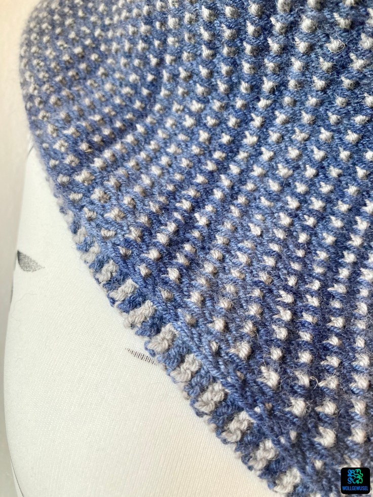 Verstrickt habe ich am Ende 239g der Hauptfarbe und 145g der Kontrastfarbe, sodass ich nur kleine Reste von 11g und 5g über habe. Das finde ich gut. Und so einen kleine Rest des Garns hebe ich gerne auf, falls ich mal hängenbleibe oder anderswie ein kleiner Schaden entsteht. Dann kann ich mit dem Originalgarn flicken.