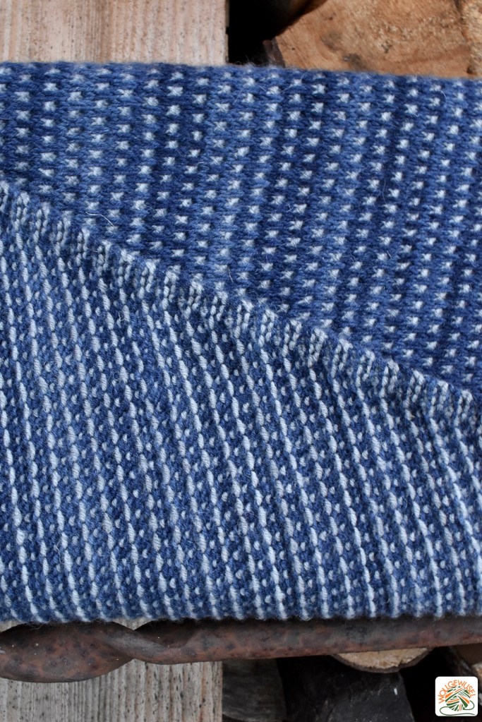 Schlussendlich wechselt man alle zwei Reihen die Farbe. Der Musterbereich wird immer breiter bzw. nach der Mitte sukzessive weider schmaler durch einfache Zu-/Abnahmen. Die Ränder werden durch eine Streifen krausrechter Maschen gesäumt, die das Tuch schön einfassen. Ich mag das handwerklich einfache Muster, das trotzdem effektvoll rauskommt. Je nach Garnwahl wirkt es völlig anders. Ich habe durch die Ravelry-Projekte gestöbert und mehrere Tücher gesehen, bei denen ich auf den ersten Blick nicht gedacht hätte, dass es die gleiche Anleitung ist. Das Muster kommt je nach Garstärke und -art sowie der Stärke des Kontrasts und ob die Hauptfarbe oder die Kontastfarbe dunkler ist, ganz anders rüber.
