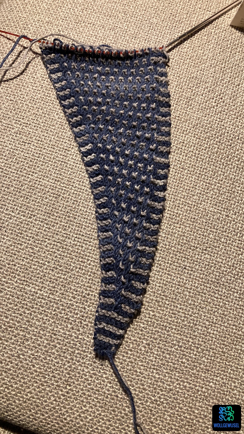 Die Anleitung war mir in den Vorschlägen von ravelry bzgl. neu erschienener Designs über den Weg gelaufen. Ein schlankes Dreieckstuch, das man gut um den Hals wickeln kann. Zweifarbig gestrickt mit einem einfachen Mosaikmuster, umgesetzt mit Hebemaschen. Und die Tuchgröße ist perfekt anpassbar an die Wollmenge, die man hat, da das Tuch von Spitze zu Spitze gestrickt wird. Nach der Hälfte des Garns kann man so also die Zunahmen beenden und mit den Abnahmen beginnen, sodass man kaum Reste behält. Gestrickt aus DK-garn, also ein richtig schön warmes Winterkuscheltuch. Und dann war die Anleitung auch noch kostenfrei. Das alles beschreibt den Born Slippy von Hedgehog Fibers (ravelry-Link).