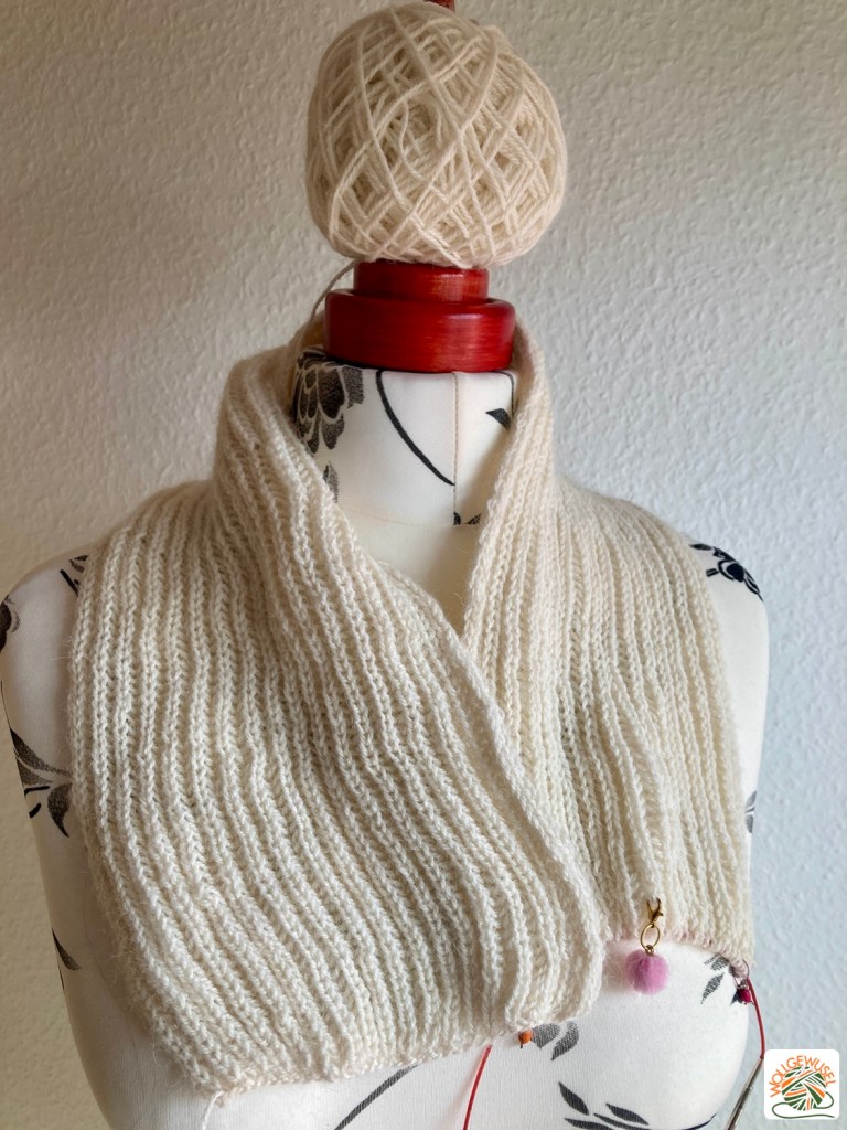 Mit der Soft Alpaca von Hobbii und Nadelstärke 4,0mm arbeitet sich das Garn gut und ergibt ein fluffiges Gestrick. Ich habe inzwischen noch nicht mal 1,5 Knäul verstrickt und eine Länge von ungefähr 60cm erreicht.