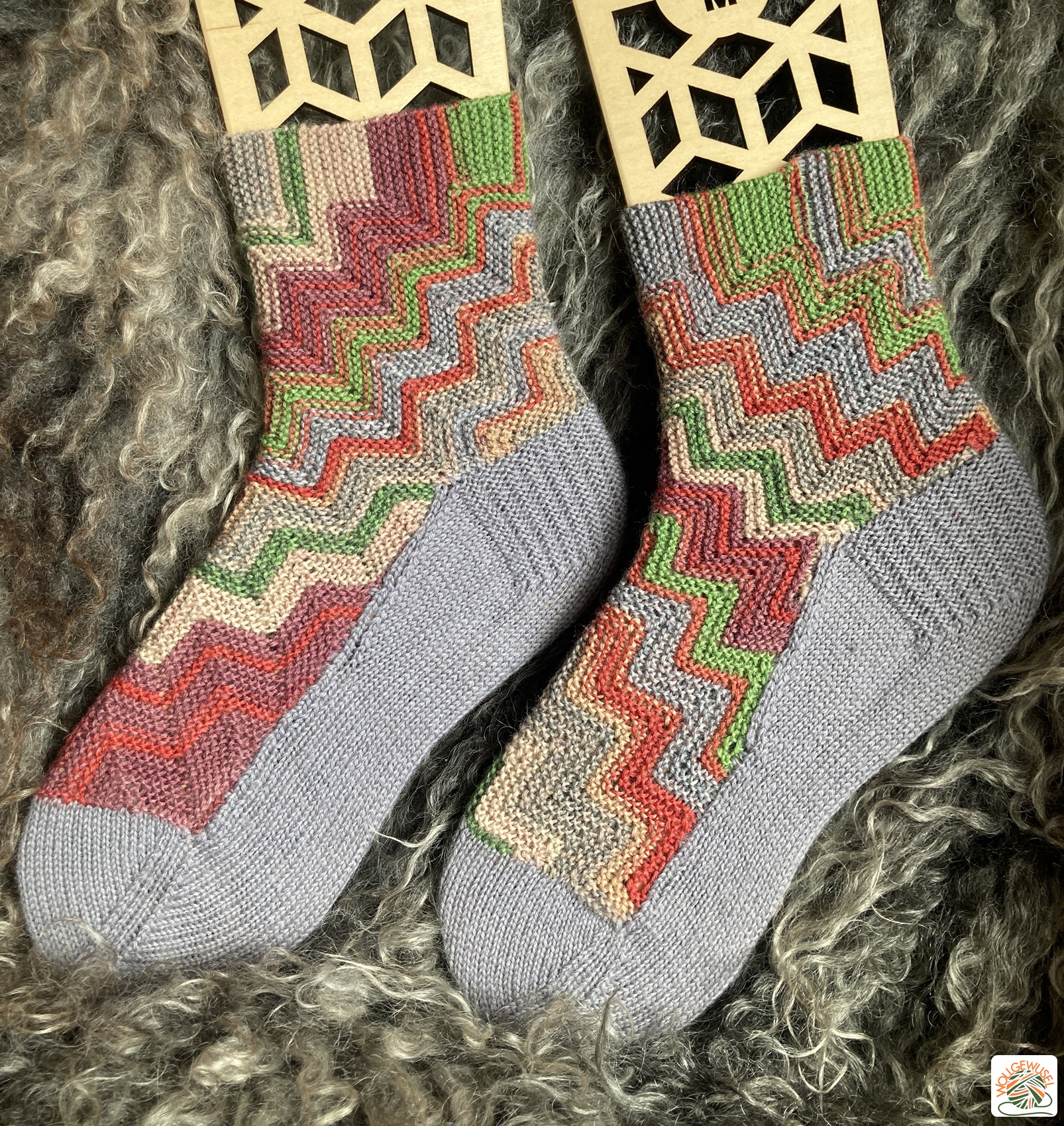 Ich habe einen Rest graue Discounterwolle (Vendita) verarbeitet und ein 50g-Knäul, das 2018 eigentlich mal ein Knubbelchen werden sollte, von Gründl Hot Socks. Das selbstmusternde Garn kommt in dem Zackenmuster super rüber und die Socken sehen deshalb natürlich auch nicht gleich aus. Aber das finde ich hier richtig gut. Und so blieb es auch bei der zweiten Socke noch ein wenig spannend, weil ich nie wusste, wie die Farbfolge auf der Wolle sich im Muster manifestiert.