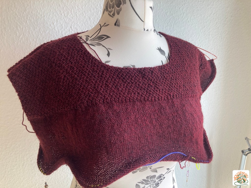 In meinem Urlaub habe ich dann endlich mal wieder einen Pullover angeschlagen. Ich habe mich für die Anleitung Relina von JoélJoél (ravelryl-Link) entschieden. Ein einfacher, etwas kastiger Pullover mit überschnittenen Ärmeln und Perlmuster im Bereich der Schultern. Ich hatte eigentlich ein anderes Garn im Kopf und wollte einen Sommerpullover, also aus Baumwollgarn stricken, aber die Maschenprobe passte auf Biegen und Brechen nicht. Am Ende habe ich mich für ein reines Wollgarn mit Superwash-Behandlung, die Happy Sheep Baby Wool, ebenfalls von Hobbii, in dunklem Weinrot entschieden. Die habe ich schon seit 2019 als Pullovermenge im Wollberg und hier scheint sie nun ihre Bestimmung gefunden zu haben.