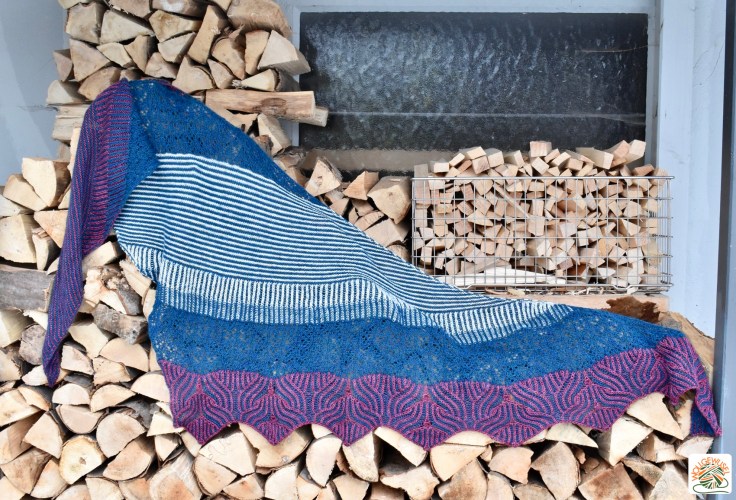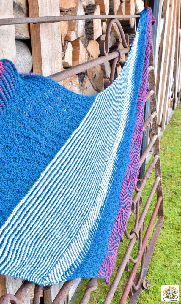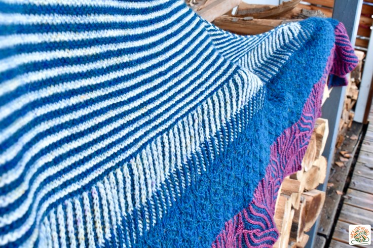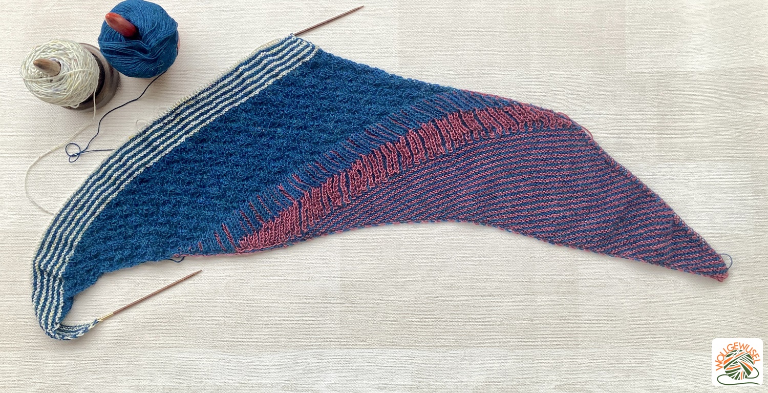 Das Tuch wird an einem der spitzen Zippel (Fachwort! :D ) begonnen, sodass die Reihen nach und nach immer länger werden. Auf einer Seite werden langsam Abnahmen gestrickt, auf der anderen Seite der Reihen in engerer Taktung Zunahmen, sodass eine schräge Kontur entsteht. Innerhalb dieses Grundgerüsts wechseln sich Muster- und Farbabschnitte ab: