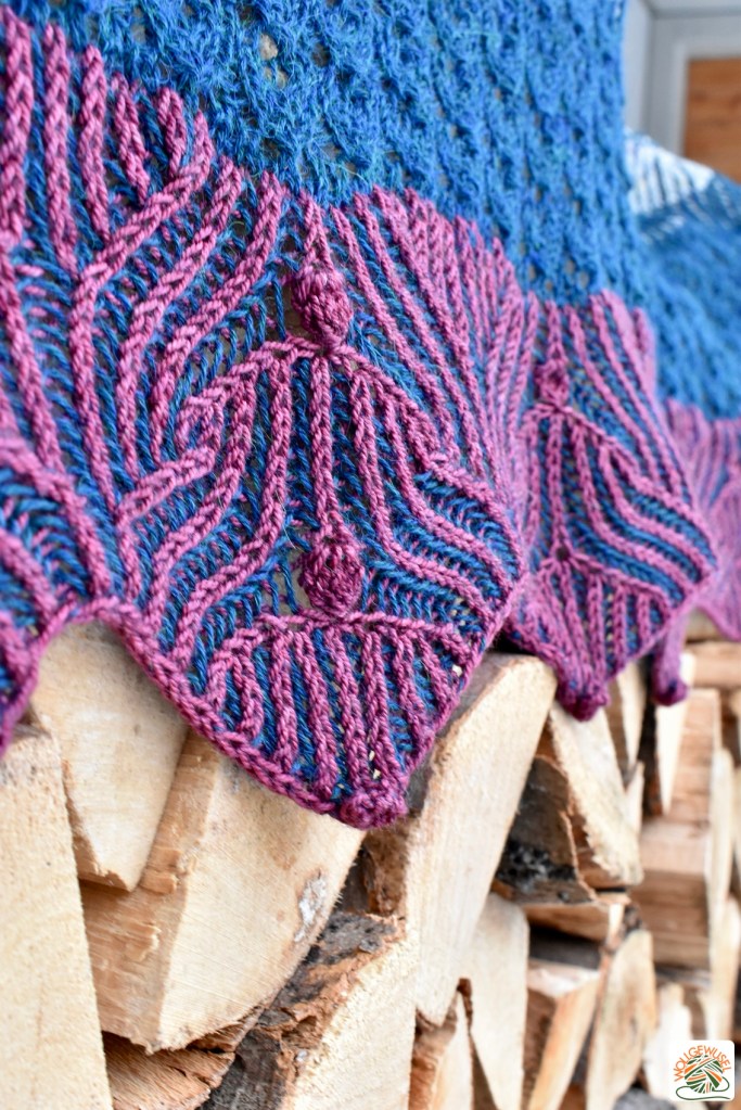 Abgeschlossen wird das Tuch mit einem floralen Muster im zweifarbigen Patent und als Highlight werden dort auch Noppen (Baubles) eingestrickt. Auch hier habe ich etwas variiert. Die Designerin gibt in der Anleitung eine Option, was man tun soll, wenn man keine Noppen stricken möchte. Und da ich auch hier etwas Not mit dem näher kommenden Fadenende hatte, habe ich in der zweiten Reihe Noppen nur jede zweite gestrickt. So hat es gut gepasst und es war die richtige Entscheidung, da am Ende wirklich nur noch ein Fitzelchen rotes Garn übrig war.
